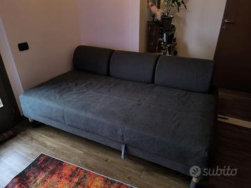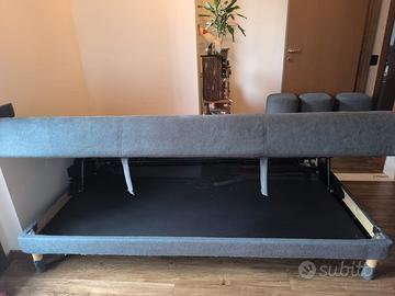 Divano / Letto di 2 mt. di lunghezza x 118 cm di larghezza x 45 cm di altezza. Con tre cuscini sfoderabili e modulabili da 65 cm che formano lo schienale. Materasso di 2 mt. di lunghezza x 118 cm di larghezza x 10 cm di spessore e doghe in legno. Contenitore sottostante grande e capiente, tessuto color grigio, ottimo stato.