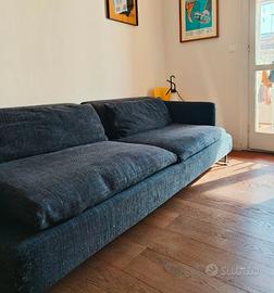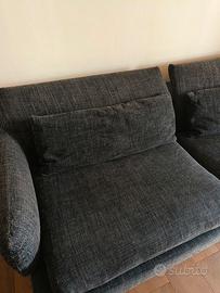 Lo schienale è dotato di movimento a due posizioni, una bassa molto elegante anche da centro stanza (altezza schienale 29 cm) , e una alta per guardare la TV (altezza schienale 45). Cuscini di seduta e poggiareni in piuma con anima in poliuretano, interamente sfoderabile. Rivestito in tessuto blu scuro - grigio scuro tramato, leggero segno di usura come in foto sul tessuto, struttura e imbottiture perfette.