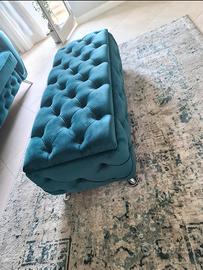 4 posti , con braccioli e spalliera in lavorazione capitonnè, con 4 cuscini di bellezza,e piedi in acciaio,