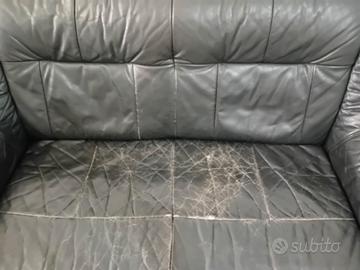 Divano in pelle nera due posti abbondanti. Visibili segni di usura.