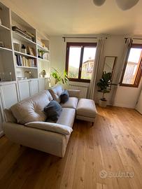 Divano poltrone sofà in tessuto antigraffio anti macchia. Con garanzia di cinque anni sul tessuto. 4 posti con pouf. Colore beige in stile nordico
