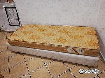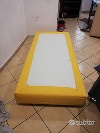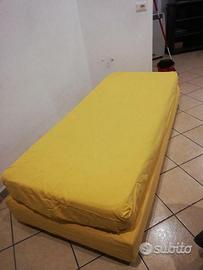 Letto singolo trasformabile in divano perché ha 3 cuscini grandi sagomati come spalliera. Compreso materasso e la rete è un cassone fisso in legno con imbottitura bianca, il copriletto e scoprirete su misura di color giallo lo diamo compreso con il letto e si può togliere con bottoni automatici, completamente sfoderabile. È carino sia in giallo che in bianco. Vendo euro 95