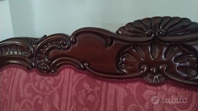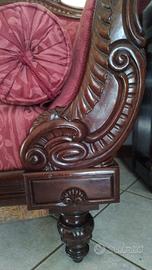 Bellissimo divano antico in stile Impero, perfetto per arredare con gusto la tua casa. - Rivestimento in tessuto bordeaux con motivi floreali. - Struttura in legno mogano intagliato color marrone scuro. - Due comodi cuscini poggiatesta.