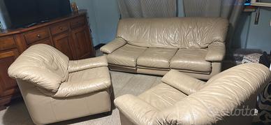 Divano 3 posti con 2 poltrone. Tutto in pelle con sedute allungabili. Datato ma in ottime condizioni.