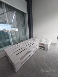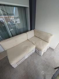 Vendo divano composto da due blocchi di pallet epal carteggiati e verniciati bianchi (120x80), i blocchi sono indipendenti e formati ciascuno da due pallet sovrapposti. Il divano si completa con due set di cuscini spessi e soffici, beige, con fodera impermeabile, anti UV, sfoderabile e lavabile. Come si vede dalle immagini i cuscini sono composti da seduta + schienale a cui si aggiunge un cuscino per completare l' angolo. Le sedute coprono l'intero pallet (120×80) mentre gli schienali sono 120x40. I cuscini sono praticamente nuovi. Vendo a malinquore in quanto non è la soluzione ideale per il mio terrazzo.