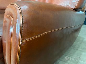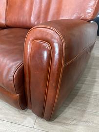 Divano semicircolare di vero cuoio con cuciture robuste.