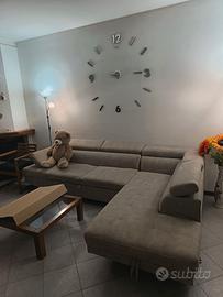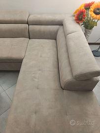 Tipologia: Divano angolare a "L" con penisola Colore: Grigio tortora / beige chiaro Materiale rivestimento: Tessuto effetto scamosciato ( microfibra o simil Alcantara) Configurazione: Penisola lato destro (vista frontale) Schienali alti con poggiatesta integrati regolabili Cuscini di seduta con cuciture a quadri Spazio relax molto ampio +letto +Contenitore