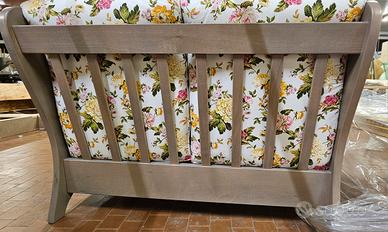 Vendesi divano nuovo con fusto in legno di faggio verniciato. Tutti i cuscini sono sfoderabili e la stoffa lavabile. Imbottitura in gomma rivestita di falda acrilica. Misure circa 135x100x100.