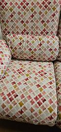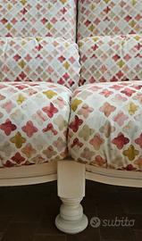 Vendesi divano nuovo con fusto in legno di faggio verniciato. Tutti i cuscini sono sfoderabili e la stoffa lavabile. Imbottitura in gomma rivestita di falda acrilica. Misure circa 135x100x100.