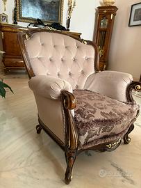 Vendo divano 3 posti + poltrona in stile classico barocco, struttura in legno massello con finiture intagliate e imbottitura capitonné.