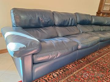 Vendo per cambio arredo divano angolare in pelle blu, tenuto in modo maniacale, sempre trattato col prodotto apposito. Presenti alcuni segni di usura nella parte bassa, ma facilmente sistemabili. Completo di certificati di origine e garanzia. Misure: 3,90 mt x 2,40 mt. Seduta 1 mt circa. Ottimo affare