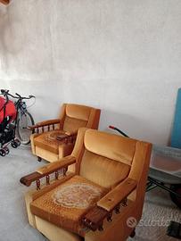 Divano e poltrone vintage con struttura in legno e rivestimento originale, tipico design anni ’70