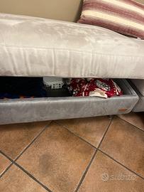 Materiale microfibra, con due puff contenitori (in foto si vede solo il primo). Cuscini in coordinato e poggiatesta reclinabili.