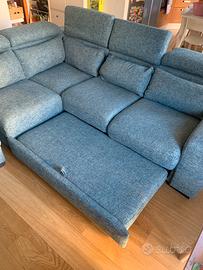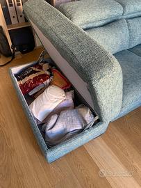 Divano Poltrone e sofà con pouf contenitore modello “Melizzano”, penisola e meccanismo scorrevole che lo trasforma in un comodo letto matrimoniale. Presenta normali segni di usura nel risvestimente ma è conservato bene. La struttura è in perfette condizioni. Completamente sfoderabile e tessuto lavabile in lavatrice, o eventualmente acquistabile anche presso un qualsiasi negozio Poltrone e sofà (fornisco documenti originali con misure) Ritiro in loco a carico dell’acquirente.