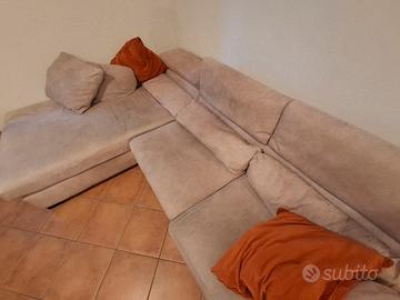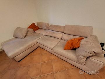 divano angolare a 4 posti in microfibra color sabbia chiaro, con schienali reclinabili e regolabili. Rivestimenti sfoderabili e lavabili in lavatrice a 30°C