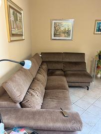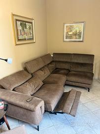 Il divano presenta 3 posti laterali sx con una seduta relax elettrica, in tessuto DIM e due posti di penisola piccola a destra.