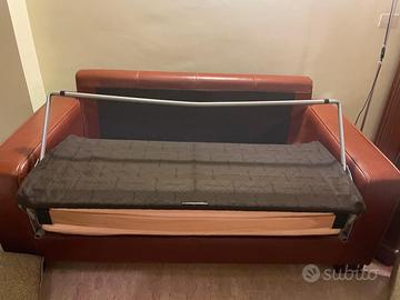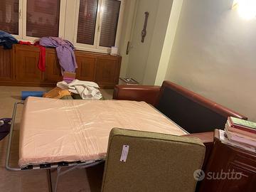 Divano con letto rete a doghe materasso (122x180) modello caprifoglio 175x95x86 struttura portante in legno massello di abete, tappezzato verde pistacchio, braccioli color cuoio in pelle.