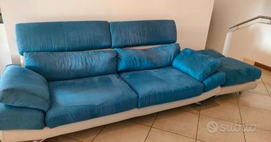 Vendo divano in alcantara colore blu di Poltrone&Sofà, completamente sfoderabile, con poggia testa e braccioli reclinabili e pouf modulare annesso.