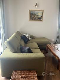 Divano a 3 posti con chaise long colore verde , usato solo un anno perché perché poi abbiamo preso il divano più grande , tenuto molto bene , solamente la fodera della chaise long si è scucita sotto in quanto l’avevo lavata e inserendola nell’imbottitura si era aperta, ma rimane sotto e non si vede . Solo consegna a mano con ritiro a carico dell’acquirente. Misure e modello in ultima foto. Compreso un cuscino con fodera uguale al divano