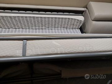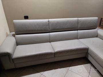 Elegante divano in pelle color chiaro (grigio ghiaccio), lungo 3,05 metri, con penisola e poggiatesta regolabili. Letto estraibile con materasso originale Poltronesofà. Comfort elevato e design moderno, ideale per salotto ampio e luminoso. In ottime condizioni, ben tenuto.