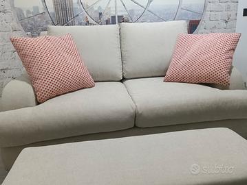 Vendo divano due posti messo compreso pouf con tessuto colore beige panna cotone. Divano e sfoderabile lavabile con due cuscini arredo....
