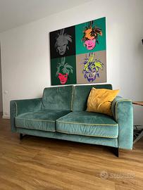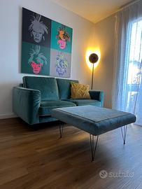 Divano Felis Kloè 2 posti (174x105 cm, H88 cm) e pouf (80x80 cm) usato pochi mesi, cambio per sostituione con divano letto, in velluto colore ottanio con bordino contrasto giallo senape.