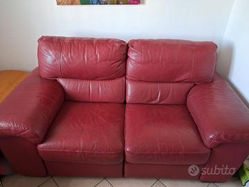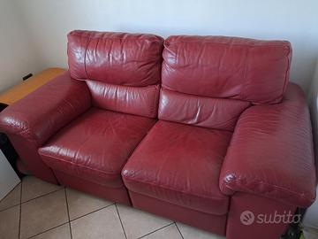 Divano relax 2 posti, schienale reclinabile, poggiapiedi estraibile, in pelle, color porpora. Struttura solida, dimensioni compatte salvaspazio adatte a piccoli ambienti, ma ampia seduta (L60 x P 57cm), imbottitura soda, esterno in morbida pelle. Meccanismo con levette manuali laterali indipendenti su entrambi i lati per reclinare lo schienale ed estendere il poggiapiedi. Dimensioni L 180 x P 95 x H 95 cm. Seduta: Altezza h 50cm, L 60 x P 57cm