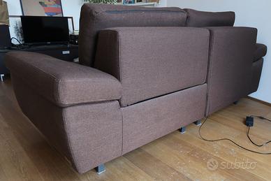 Divano Rigo in perfette condizioni. Relax elettrico su una metà. Braccioli con posizione regolabile. Tessuto marrone. 210x100xh79 cm