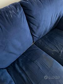 Divano due posti, colore blu in alcantara alto 84cm, lungo 168 cm e largo 85 cm. Il tessuto è usurato soprattutto nei braccioli. Si può usare con copri divano.