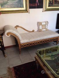 Divanetto dormeuse in legno dorato e tappezzeria chiara con cuscino. Misure : cm 180 - 60
