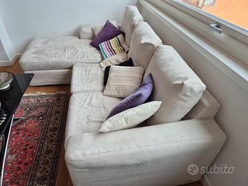 Divano "poltrone sofà" a penisola sinistra interamente sfoderabile; tessuto lavabile in lavatrice in microfibra color panna. Misure 235×170 cm, altezza 85 cm.
