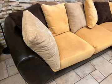 Divano La Maison Coloniale lungo 280 cm con penisola 190 cm. Fondo in pelle e cuscini microfibra. Zona Nomentana.