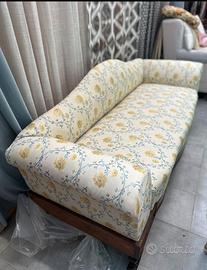 Elegante Divano a Sleigh con Motivo Floreale • Design Unico: Questo divano a sleigh si distingue per il suo schienale curvo e i braccioli arrotolati, che conferiscono un tocco di eleganza a qualsiasi ambiente. • Tessuto Floreale: Il rivestimento in tessuto presenta un delicato motivo floreale sui toni del giallo e dell'azzurro su uno sfondo color crema, che aggiunge freschezza e stile. • Dettagli Curati: La finitura della base in legno scuro
