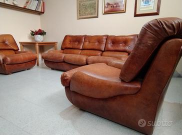 Pelle tinta cuoio, segni di usura come da foto. Il set completo è composto da 1 divano + 2 poltrone