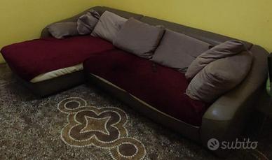 Regalo divano angolare con cuscini. L'ecopelle è usurata, motivo per cui è presente una fodera per rivestirlo. Il divano si trova in un appartamento al terzo piano.