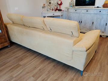 Divano sfoderabile con penisola, colore giallo zafferano. Tessuto anti macchia, tipo camoscio. Un poggia braccio presenta uno strappo di 1 cm nel tessuto. Volendo è possibile acquistare la fodera nuova presso il rivenditore che mi ha venduto il divano, anche per cambiarne il colore. Il divano ha 5 anni e non è stato molto usato.