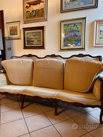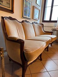 Divano in noce scuro e velluto naturale in stile retrò. Ottime condizioni con cuscini sfoderatili e rimessi a nuovo. E' possibile venderlo separatamente o assieme alle poltrone abbinate.