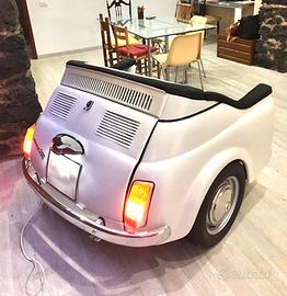 Divanetto su Fiat 500, rivestimento in Alcantara di alta qualità Made in Italy, colore bianco perla opaco, comodo baule porta oggetti ed impianto di illuminazione.