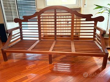 Privato, residente in Roma, vende divano in teak massello, stile etnico lusso, colore noce/ciliegio, con tappezzeria marca Etrò tagliata su misura. 3 posti, utilizzato in interno in salone. Dimensioni: