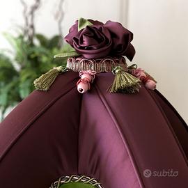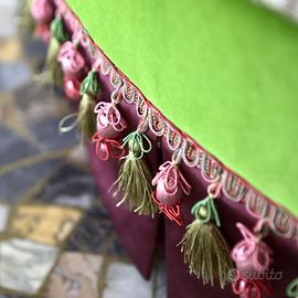 Divano centrostanza circolare, con rivestimento multicolore e vari tessuti, con fatasia e colori di ispirazione orientale. La combinazione di tessuti accentua i profili curvilinei del divano, arricchito anche da un'elegante passamaneria che riprende i colori del tessuto jacquard a fantasia delle sedute. La decorazione a rose della sommità è realizzata a mano.