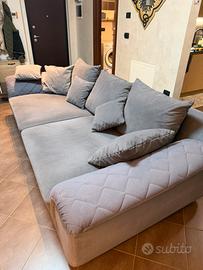 Divano grigio simil alcantara con cuscini sfoderabili 3 grandi poggia schiena 2 medi e 3 piccoli misure 262x134 spalliera h 76 seduta h 45