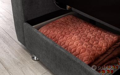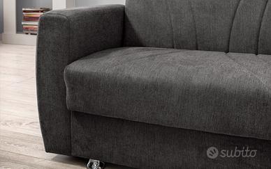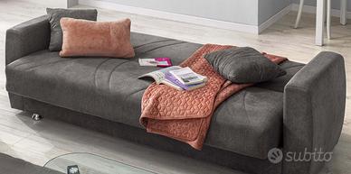Divano letto apribile a 3 posti, con vano contenitore e parte posteriore in tessuto nero. Viene fornito con due cuscini ornamentali sfoderabili. Per trasformarlo in un letto, basta esercitare una leggera pressione sullo schienale, che spingerà in avanti la seduta, aprendo il divano a libro. Dimensioni 225 x 84 x 91cm (larghezza, profondità, altezza)