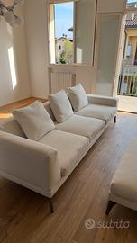 In ottime condizioni divano tre posti (AB250) con pouf ( 90X90), Acanto By Mussi minimal ed elegante dalle dimensioni contenute.(L 250xP 90xH 85). Il rivestimento della struttura ed i cuscini in tessuto beige sono completamente sfoderabili aprendo le cerniere e staccando il velcro di ancoraggio e l’imbottitura dei cuscini sedile in piuma d’oca certificata Asso piuma etichetta Avorio certificata (90% piuma d’oca, 10% piuma d’anatra) (vedi foto allegata). I piedini sono in metallo verniciato a polveri epossidiche color grigio canna di fucile. VENDO per cambio casa, prezzo articolo nuovo € 7.200