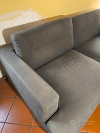 Divano artigianale a tre posti, seduta lunga. Tessuto grigio scuro/antracite. Presenta segni del tempo come da foto nel rivestimento, ma nessun problema strutturale. I piedi sono in acciaio cromato. Visto e piaciuto. La consegna è solo a mano a carico dell'acquirente.