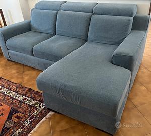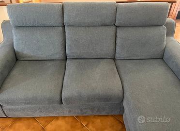 Vendo divano tre posti sfoderabile, con chaise longue sul lato destro (guardando il divano) e poggiatesta reclinabili. Colore blu ceruleo. Il divano è stato acquistato cinque anni fa e si presenta in ottime condizioni e senza macchie. Viene cambiato solo per necessità di uno più grande.