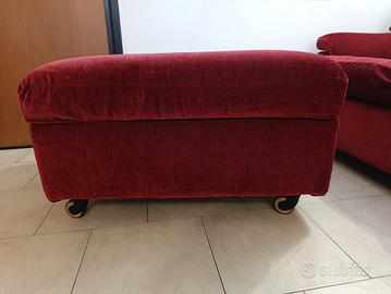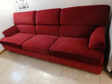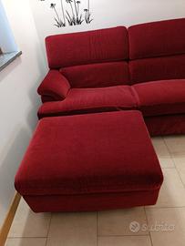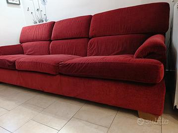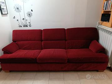 Divano tre posti con pouf. Sfoderabile. Colore bordeaux. Misure del divano: lunghezza circa 250 cm larghezza circa 90 cm altezza dello schienale da terra circa 90 cm altezza della seduta da terra circa 45 cm. Misure del pouf: 65 cm x 85 cm (altezza da terra circa 45 cm).