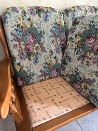 Divano tre posti e poltrona con telaio di legno massello in ottime condizioni, stile rustico