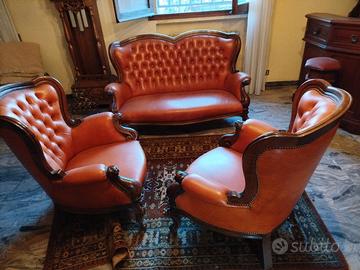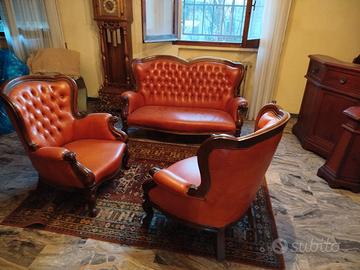 Divano tre posti in pelle e rifinito in legno massello più due poltrone sempre abbinate al divano più tavolino. TUTTO IN OTTIMO Stato