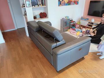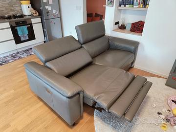 divano a tre posti in vera pelle grana grossa grigio movimento relax. due recliner elettrici con bottoni sul lato. poggiatesta regolabili. misura 1,90 cm lunghezza per 95 di profondità e 78 altezza (poggiatesta abbassati). un modulo di seduta è da 75 cm. profondità seduta 55 cm il divano ha due anni ed è in otte condizioni