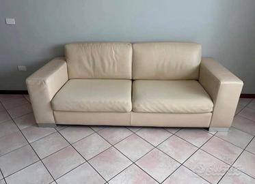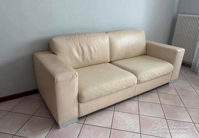Divano in vera pelle colore beige, con le rispettive dimensioni: 230 cm lunghezza 90 cm larghezza 63 cm altezza
